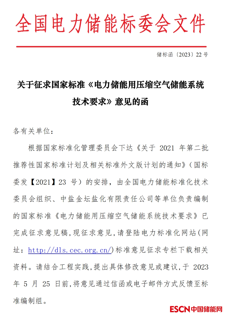 關(guān)于征求國家標準《電力儲能用壓縮空氣儲能系統(tǒng)技術(shù)要求》意見的函