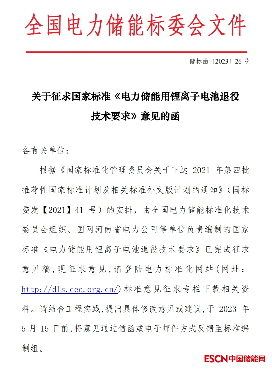 關(guān)于征求國家標(biāo)準(zhǔn)《電力儲能用鋰離子電池退役技術(shù)要求》意見的函