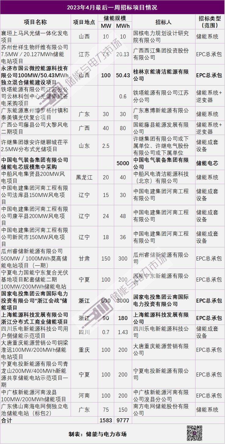 4月份最后一周,開啟招標的項目包括儲能系統(tǒng)、儲能項目EPC總包、儲能電芯采購等多種形式,總規(guī)模接近10GWh,這其中: