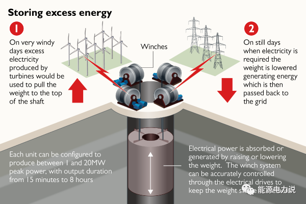 2016年,英國(guó)Gravitricity公司提出鉆井儲(chǔ)能解決方案。Gravitricity主要瞄準(zhǔn)廢棄鉆井平臺(tái)與礦坑,重力媒介是500噸的“砝碼”,在深度超300米的豎井中重復(fù)吊起與放下鉆機(jī),通過(guò)電動(dòng)絞盤,先將鉆機(jī)拉到廢棄礦井上方,需要用電時(shí)再讓鉆機(jī)放下,如此進(jìn)行儲(chǔ)存和釋放電能。