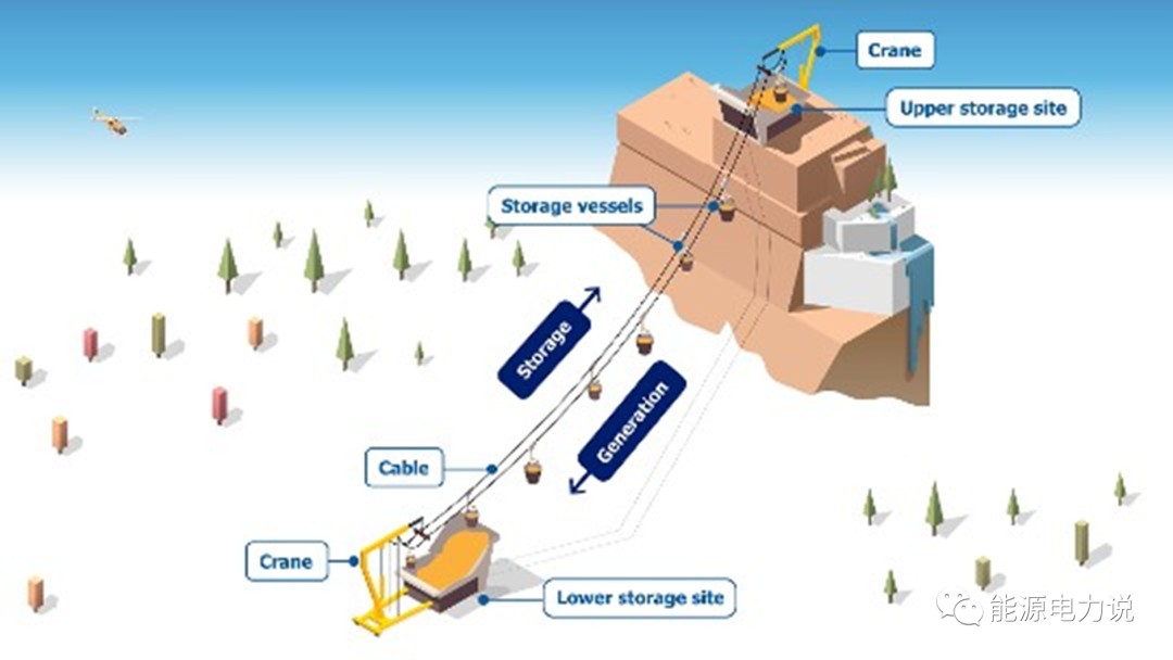 MGES由陡峭山坡、起重機(jī)、儲(chǔ)存容器(可以裝砂石或水)、電纜等組成。儲(chǔ)電時(shí),利用余電驅(qū)動(dòng)發(fā)動(dòng)機(jī)將裝滿沙石的纜車從山坡底部移動(dòng)到頂部,電能轉(zhuǎn)化為勢(shì)能。發(fā)電時(shí),將纜車從山坡頂部下降到底部,勢(shì)能轉(zhuǎn)化為電能。