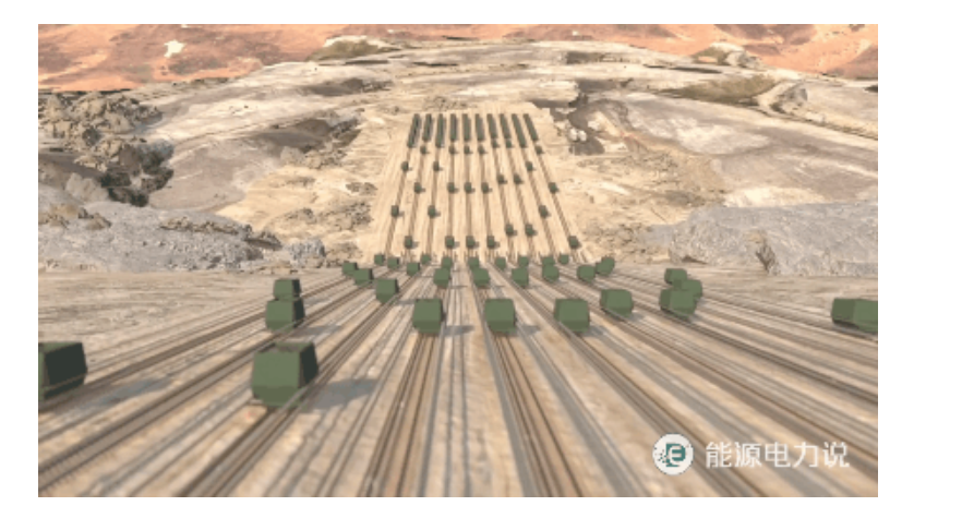 ARES公司建造了一條6英里長(zhǎng)的上坡軌道,配有重裝機(jī)車,機(jī)車是實(shí)心機(jī)混凝土,每輛重達(dá)300噸,最高時(shí)速為16英里。儲(chǔ)電時(shí),利用余電將推動(dòng)高效電機(jī)將機(jī)車推至坡頂“車站”,電能儲(chǔ)存為重力勢(shì)能;發(fā)電時(shí),釋放機(jī)車下坡,重力勢(shì)能轉(zhuǎn)化為電能,開(kāi)始發(fā)電。
