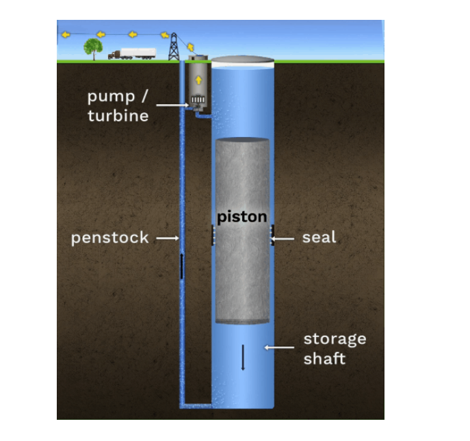活塞式儲(chǔ)能,可以看做一個(gè)“水電池”,按采礦業(yè)的標(biāo)準(zhǔn)技術(shù)挖出豎井,在豎井中建造一個(gè)由加固巖石制成的活塞,在豎井中添加水并密封,形成一個(gè)閉環(huán)系統(tǒng)。當(dāng)電力富裕時(shí),由水泵水輪機(jī)抽水加壓,提升活塞,存儲(chǔ)能量;發(fā)電時(shí),活塞下落,其勢(shì)能傳遞給水流,由水泵水輪機(jī)轉(zhuǎn)換為機(jī)械能帶動(dòng)發(fā)電機(jī)發(fā)電。
