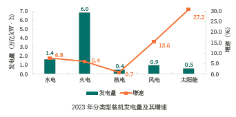 全國發(fā)電量穩(wěn)步增長,火電發(fā)電量比重持續(xù)下降。2023年,預計全國發(fā)電量為9.3萬億千瓦時,比上年增長7.2%。其中,水電、火電、核電、風電、太陽能發(fā)電量占比分別為15.5%、64.8%、4.5%、9.3%、5.8%,較上年分別變化-0.1、-1.1、-0.3、0.5、0.9個百分點,對發(fā)電增長的貢獻率分別為14.8%、49.3%、0.5%、16.7%、18.7%。預計全國發(fā)電設備平均利用小時數(shù)為3651小時,比上年下降約37小時,其中,水電、火電利用小時數(shù)比上年分別上升138、55小時,核電、風電、太陽能利用小時數(shù)比上年分別減少約66、11、27小時。