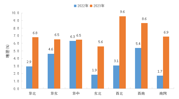 華北、華東、南方電網區(qū)域是用電增長主要拉動區(qū)域。2023年,預計華北(含蒙西)、華東、華中、東北、西北、西南、南方電網區(qū)域全社會用電量比上年分別增長6.8%、6.5%、6.5%、5.6%、9.6%、8.6%、6.9%,西北電網區(qū)域用電增速最高,各區(qū)域用電增速均較上年不同程度反彈。預計華北(含蒙西)、華東、南方電網區(qū)域是拉動用電增長的主要區(qū)域,合計貢獻率超過60%。