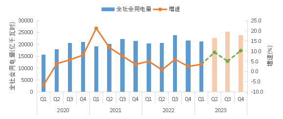 分季度看,預計2023年各季度全國全社會用電量增速分別為3.6%、9.4%、5.1%、10.3%,受上年基數(shù)影響,第二、四季度用電增速顯著高于第一、三季度用電增速。