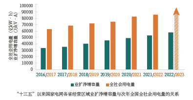 業(yè)擴凈增容量較快增長,為用電增長提供有力支撐。2022年,國家電網公司經營區(qū)域累計完成業(yè)擴凈增容量5.8億千伏安,比上年增長9.1%。根據歷年業(yè)擴凈增容量與次年全國全社會用電量的關系,2023年全國全社會用電量有望保持良好的增長態(tài)勢。