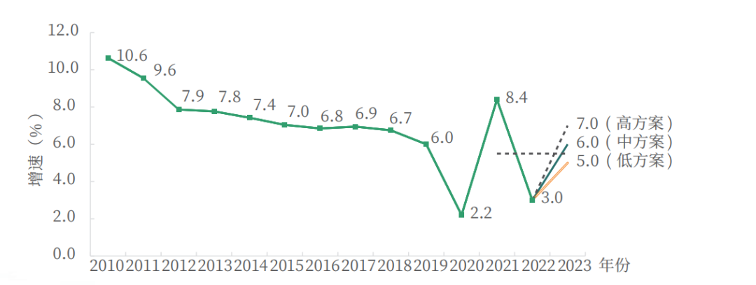 宏觀經濟方面,受地緣政治事件和金融風險上升拖累,全球經濟增速進一步放緩。疫情防控措施加快優(yōu)化調整,疫情對經濟的影響將顯著減??;存量、增量宏觀政策疊加發(fā)力,加之基數(shù)效應明顯,預計2023年我國經濟運行有望整體明顯好轉??紤]國際經濟、疫情形勢、房地產政策效果等不確定因素設置高、中、低三個方案對經濟進行預測,預計2023年GDP分別增長5.0%、6.0%、7.0%,兩年平均增速分別為4.0%、4.5%、5.0%。中方案下,三次產業(yè)增速分別為5.0%、5.9%和6.3%,四個季度GDP增速分別為4.5%、8.1%、5.5%、6.0%,兩年平均增速分別為4.6%、4.2%、4.7%、4.8%。