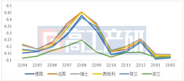 2022年4月-2023年2月歐洲主要國(guó)家電價(jià)(歐元/KWh)