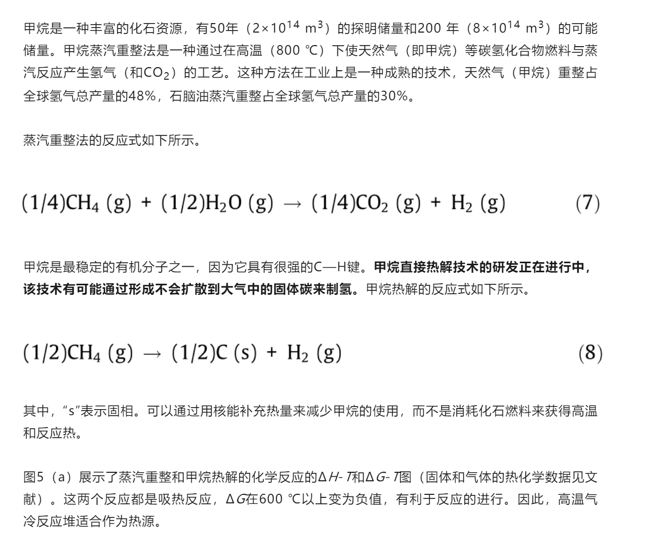 圖2中,下方所示的兩種制氫方法涉及使用碳氫化合物作為原料的吸熱化學(xué)反應(yīng)。用核電補充化學(xué)反應(yīng)所需的熱量,可以減少制氫中的化石資源消耗。用碳氫化合物和水制氫的蒸汽重整法是一項成熟的工業(yè)技術(shù),而正在開發(fā)中的甲烷熱解法則將甲烷轉(zhuǎn)化為氫氣和固體碳。