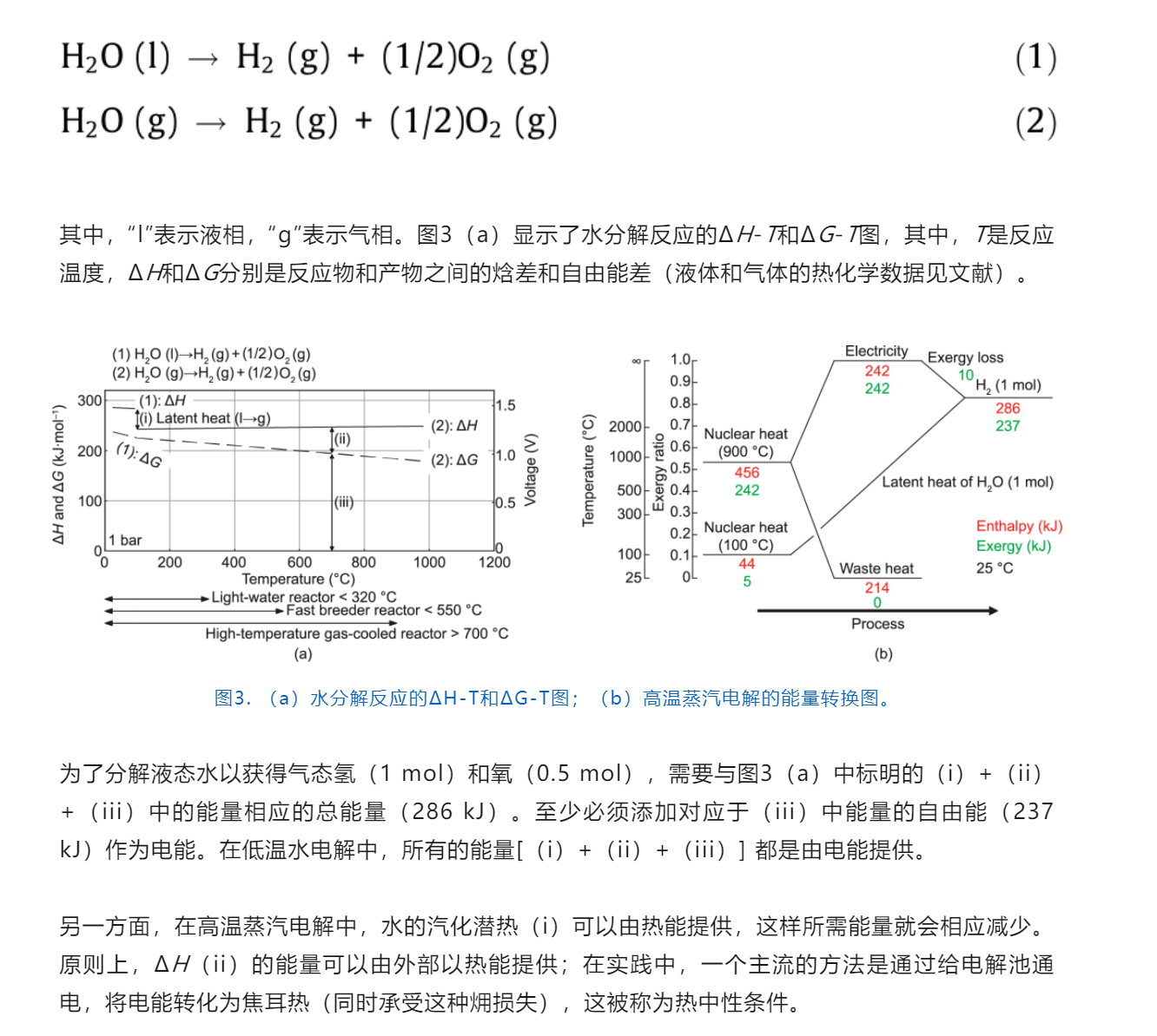由于低溫水電解法可以僅由電能驅(qū)動,因此可以使用輕水反應(yīng)器、快中子增殖反應(yīng)器或高溫氣冷反應(yīng)器作為能源。高溫蒸汽電解所需的水汽化熱(i)也可以由輕水反應(yīng)堆、快中子增殖反應(yīng)堆或高溫氣冷反應(yīng)堆提供。
