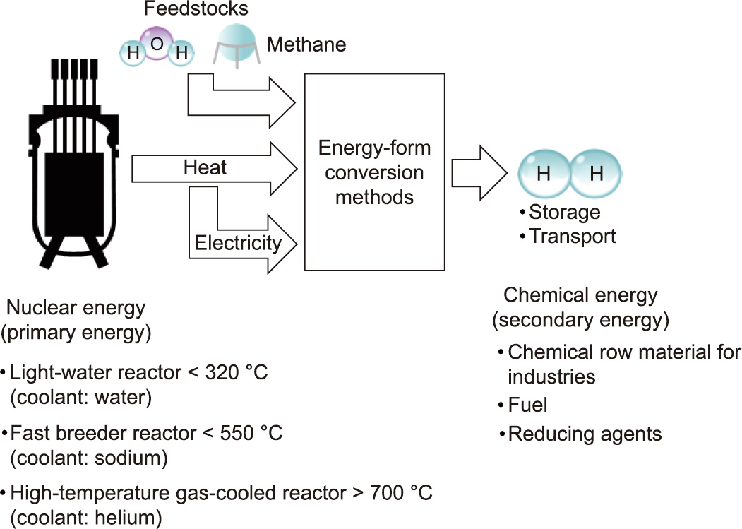 圖1展示了利用核能制氫所涉及的能量形式轉(zhuǎn)換。作為二次能源,氫氣可以通過將水或碳氫化合物(化石資源)作為原料加入核能(一次能源)來生產(chǎn)。也就是說,這個過程將核能轉(zhuǎn)化為氫氣的化學(xué)能。產(chǎn)生熱能的核反應(yīng)堆包括以下反應(yīng)堆類型,每個反應(yīng)堆的熱能可用溫度從低到高排序:輕水反應(yīng)堆(冷卻劑:水);快中子增殖反應(yīng)堆(冷卻劑:鈉),以及高溫氣冷反應(yīng)堆(冷卻劑:氦氣)。