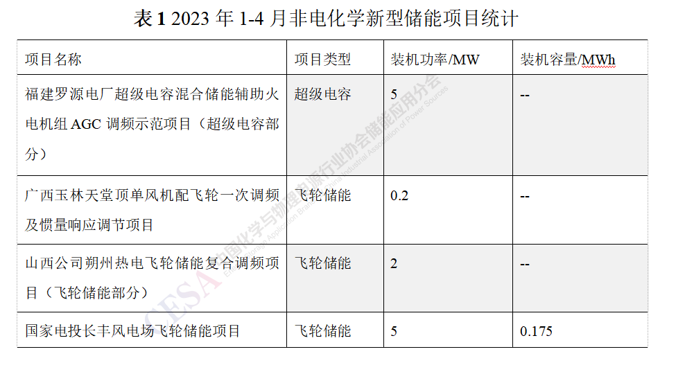 2023年1-4月份非電化學(xué)新型儲(chǔ)能項(xiàng)目較少,共投運(yùn)飛輪儲(chǔ)能項(xiàng)目3個(gè),裝機(jī)規(guī)模為7.2MW,超級(jí)電容項(xiàng)目1個(gè),裝機(jī)規(guī)模為5MW。
