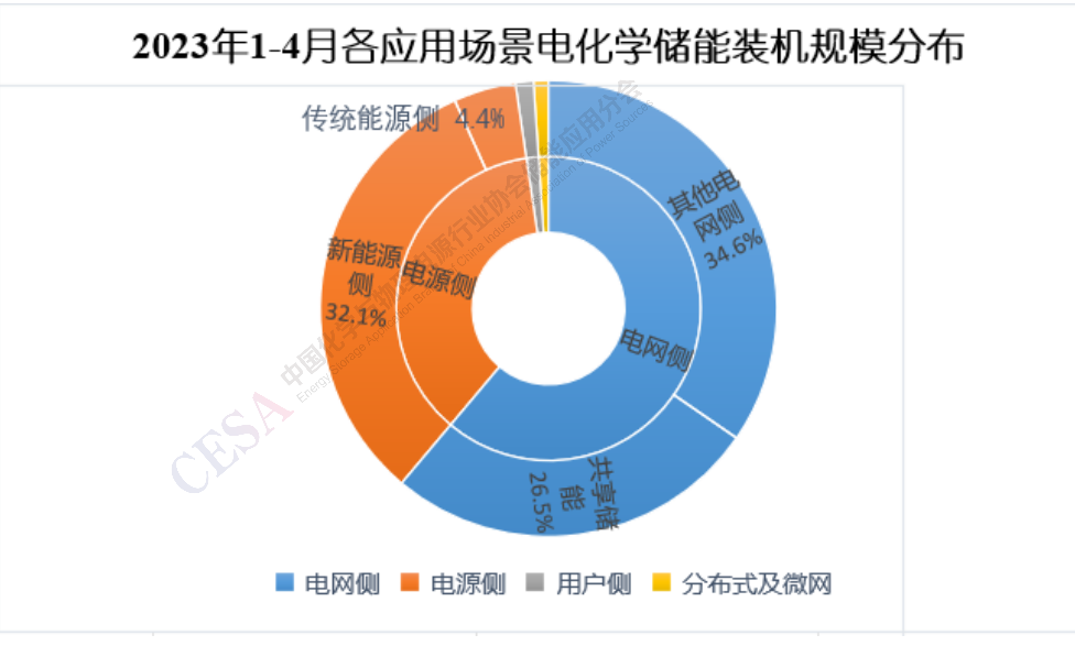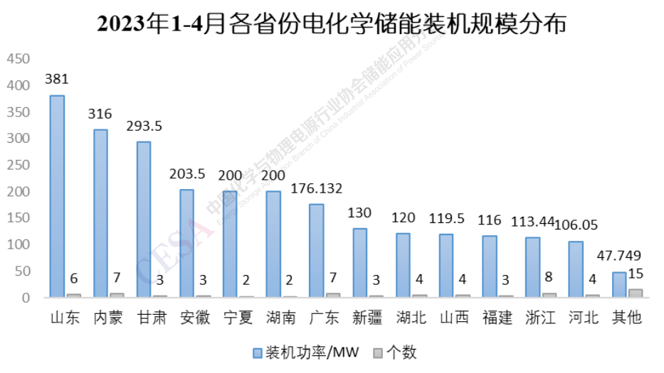 由圖5可知,2023年1-4月份共有13個(gè)省份電化學(xué)儲(chǔ)能項(xiàng)目裝機(jī)規(guī)模達(dá)到100MW,依次是山東、內(nèi)蒙古、甘肅、安徽、寧夏、湖南、廣東、新疆、湖北、山西、福建、浙江和河北。其中山東和內(nèi)蒙古裝機(jī)規(guī)模分別為381MW和316MW,從規(guī)模和數(shù)量總體上講,在各省份中遙遙領(lǐng)先,山東共有山東沂水300MW/600MWh儲(chǔ)能示范項(xiàng)目一期和萊北華電獨(dú)立儲(chǔ)能電站2個(gè)100MW級(jí)電網(wǎng)側(cè)儲(chǔ)能項(xiàng)目投運(yùn);同樣得益于兩個(gè)100MW級(jí)儲(chǔ)能項(xiàng)目的投運(yùn),甘肅電化學(xué)儲(chǔ)能裝機(jī)規(guī)模位列各省份第3位,其中由中國(guó)能建西北院設(shè)計(jì)的330千伏建航儲(chǔ)能電站一期工程最為惹眼,它是目前全國(guó)電壓等級(jí)最高的儲(chǔ)能電站,其作為甘肅省“十四五”第一批新能源項(xiàng)目的代表之一,為甘肅新型儲(chǔ)能項(xiàng)目的發(fā)展樹(shù)立了榜樣;安徽、寧夏、湖南三個(gè)省份,自去年開(kāi)始大力發(fā)展大型電網(wǎng)側(cè)共享儲(chǔ)能和獨(dú)立儲(chǔ)能項(xiàng)目,1-4月,也各有兩個(gè)100MW級(jí)電化學(xué)儲(chǔ)能項(xiàng)目投運(yùn),裝機(jī)規(guī)模躋身前列,廣東和浙江兩省電化學(xué)儲(chǔ)能項(xiàng)目投運(yùn)個(gè)數(shù)頗多,但總裝機(jī)規(guī)模相對(duì)較小,這主要是其用戶側(cè)儲(chǔ)能占比較大的應(yīng)用場(chǎng)景構(gòu)成導(dǎo)致的。