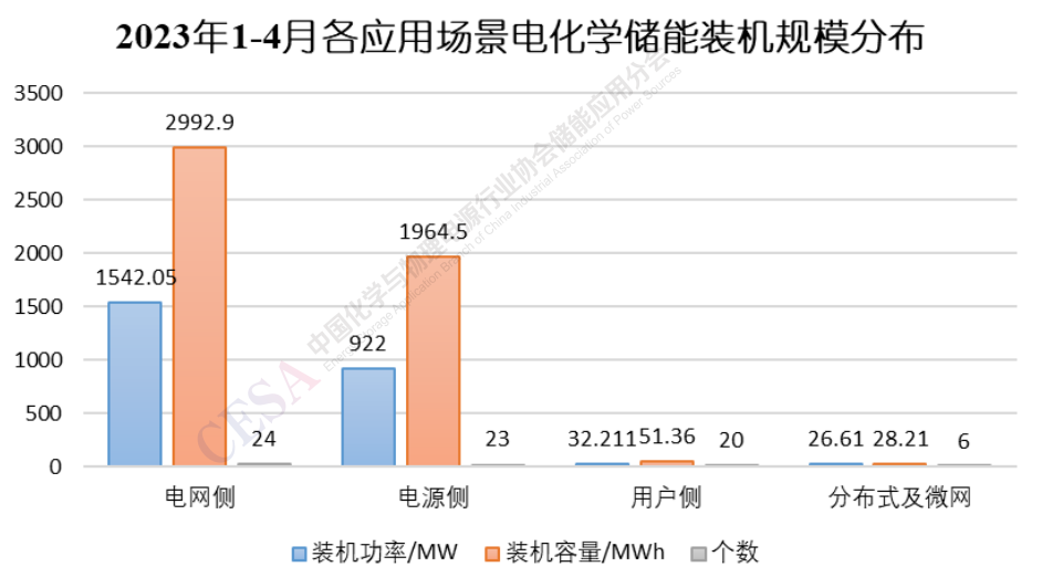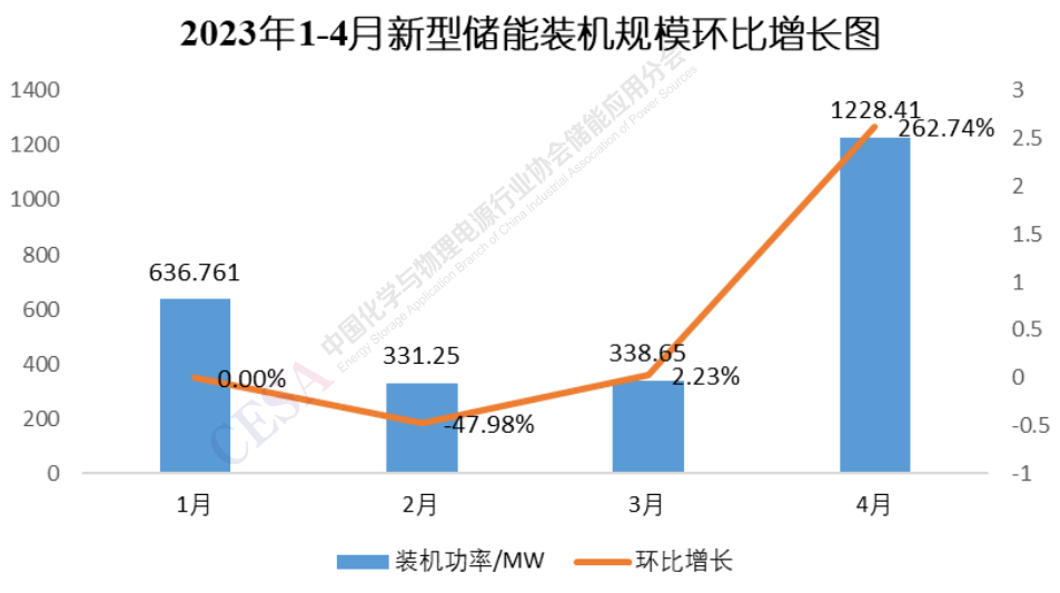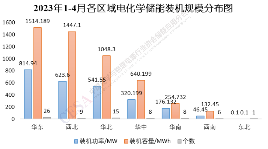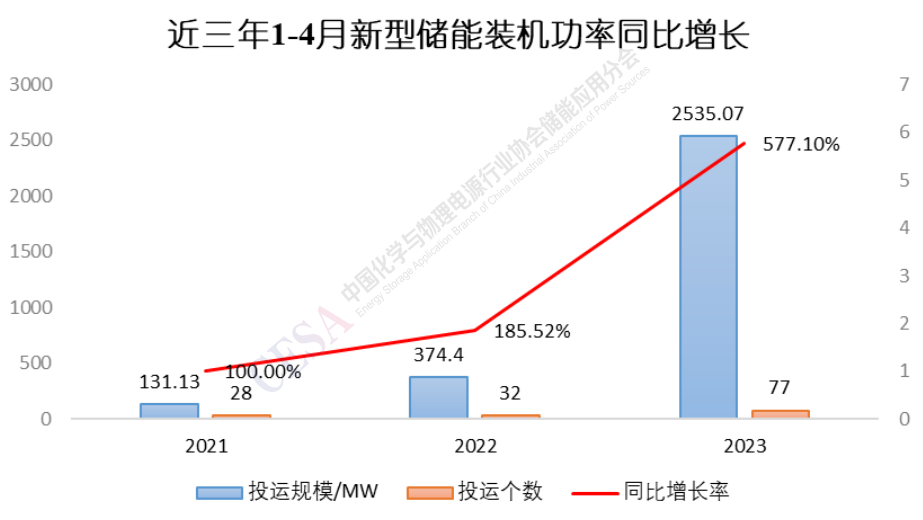 由圖1可見(jiàn),2023年1-4月新型儲(chǔ)能裝機(jī)功率從數(shù)量和體量上較前兩年都有較大增長(zhǎng),裝機(jī)功率較去年同期(374.4MW)同比增長(zhǎng)577.1%,總規(guī)模達(dá)到2535.07MW。