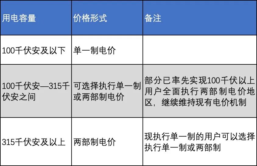在價格形式上,現行普遍做法是一般工商業(yè)及其他用戶執(zhí)行單一制電價,大工業(yè)用戶實行兩部制電價。第三監(jiān)管周期不再區(qū)分用戶類別后,原則上按用電容量不同確定執(zhí)行單一制電價或兩部制電價,在繼續(xù)逐步擴大兩部制電價執(zhí)行范圍的同時,考慮電價政策平穩(wěn)實施,規(guī)定對100千伏安以上現行執(zhí)行單一制電價的用戶,由用戶選擇執(zhí)行單一制或兩部制電價。