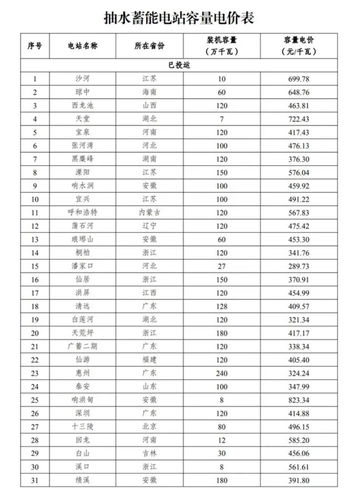 中國儲能網訊:等待兩年,抽水蓄能電站終于迎來明確的容量電價表。