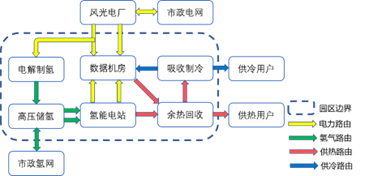 當(dāng)風(fēng)光電力充裕,超出數(shù)據(jù)中心用電需求的季節(jié),可利用多余電力電解水制氫,并進(jìn)行跨季節(jié)儲存;當(dāng)風(fēng)光電力不足時,利用儲存的氫氣通過氫燃料電池設(shè)備發(fā)電,補(bǔ)足電力缺口,而發(fā)電的副產(chǎn)品水可回收利用,再次用于電解制氫??梢园l(fā)現(xiàn),只要合理的設(shè)計匹配風(fēng)光電廠及制氫、儲氫設(shè)備的容量,理論上就可以實(shí)現(xiàn)該微電網(wǎng)的“零”碳排、“零”電費(fèi)的閉環(huán)供電,若考慮數(shù)據(jù)機(jī)房及氫能電站的余熱回收利用,并向外輸出冷熱源,在獲得經(jīng)濟(jì)收益的同時,還可生產(chǎn)“負(fù)碳”,達(dá)到償還企業(yè)歷史碳足跡的目的,但該方案涉及大規(guī)模電力設(shè)施投資,其經(jīng)濟(jì)性及可靠性尚待研究。