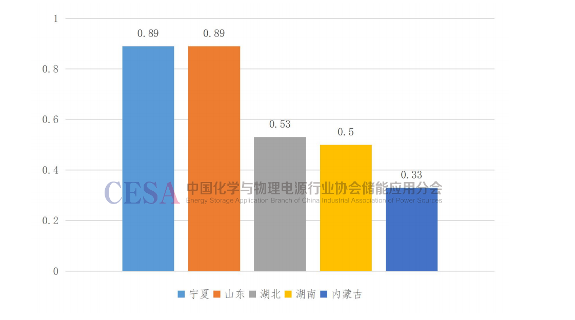 2022年新增裝機(jī)規(guī)模排名前5名的省份為:寧夏、山東、湖北、湖南和內(nèi)蒙古,新增裝機(jī)容量分別為0.89GW、0.89GW、0.53GW、0.50GW和0.33GW。