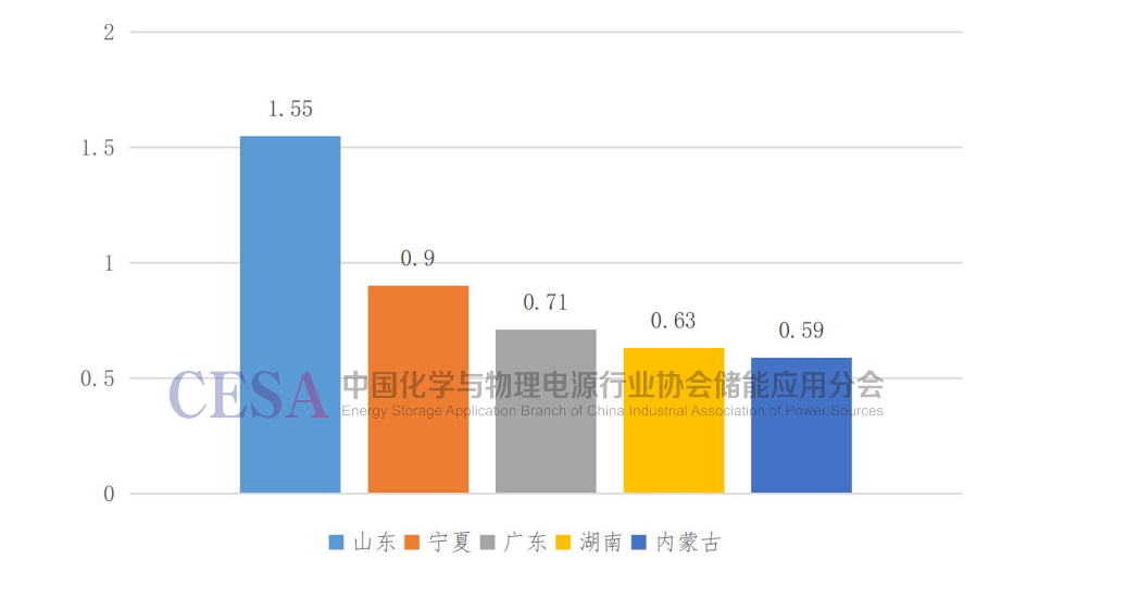 8.2022年底山東、寧夏、廣東、湖南和內(nèi)蒙古累計(jì)新型儲能裝機(jī)規(guī)模排名前5