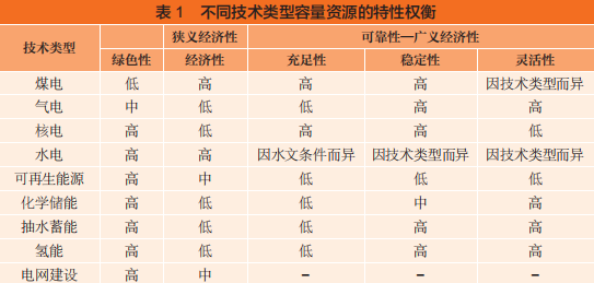 不妨將充足性、穩(wěn)定性和靈活性與市場(chǎng)化改革的目標(biāo)(經(jīng)濟(jì)性)和環(huán)境氣候政策的目標(biāo)(綠色性)放在一個(gè)框架下,來分析不同電源技術(shù)以及不同能源類型帶來的綜合變化(見表 1)。