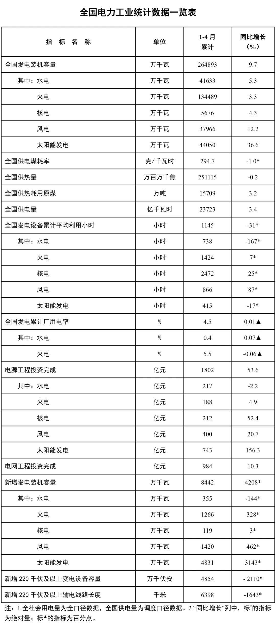 截至4月底,全國累計(jì)發(fā)電裝機(jī)容量約26.5億千瓦,同比增長9.7%。其中,風(fēng)電裝機(jī)容量約3.8億千瓦,同比增長12.2%;太陽能發(fā)電約4.4億千瓦,同比增長36.6%。