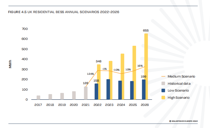 然而,由于缺乏配套支持方案和智能電表部署緩慢,未來幾年,英國戶儲市場增速預計將穩(wěn)定在當前水平。歐洲光伏協(xié)會預計,到2026年,低景氣度下,英國累計裝機量為1.3GWh;中期情景下,累計裝機量為1.8GWh;高景氣度下,這一數(shù)值為2.8GWh。