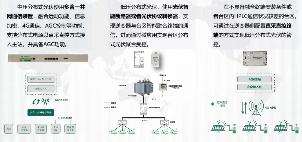 通過交易系統(tǒng)解決綠電需求,在調(diào)控聚合方面,除了管控系統(tǒng)我們也研發(fā)應(yīng)用了性價比高的各監(jiān)測控制點的終端裝置,在在10KV并網(wǎng)點和低壓區(qū)域分布式光伏聚合并網(wǎng)點加裝多合一并網(wǎng)終端,能夠正確接收并自動執(zhí)行調(diào)度、配自主站下發(fā)的指令,對逆變器、PLC、本地集控系統(tǒng)等進(jìn)行調(diào)節(jié),從而實現(xiàn)AGC子站功能。