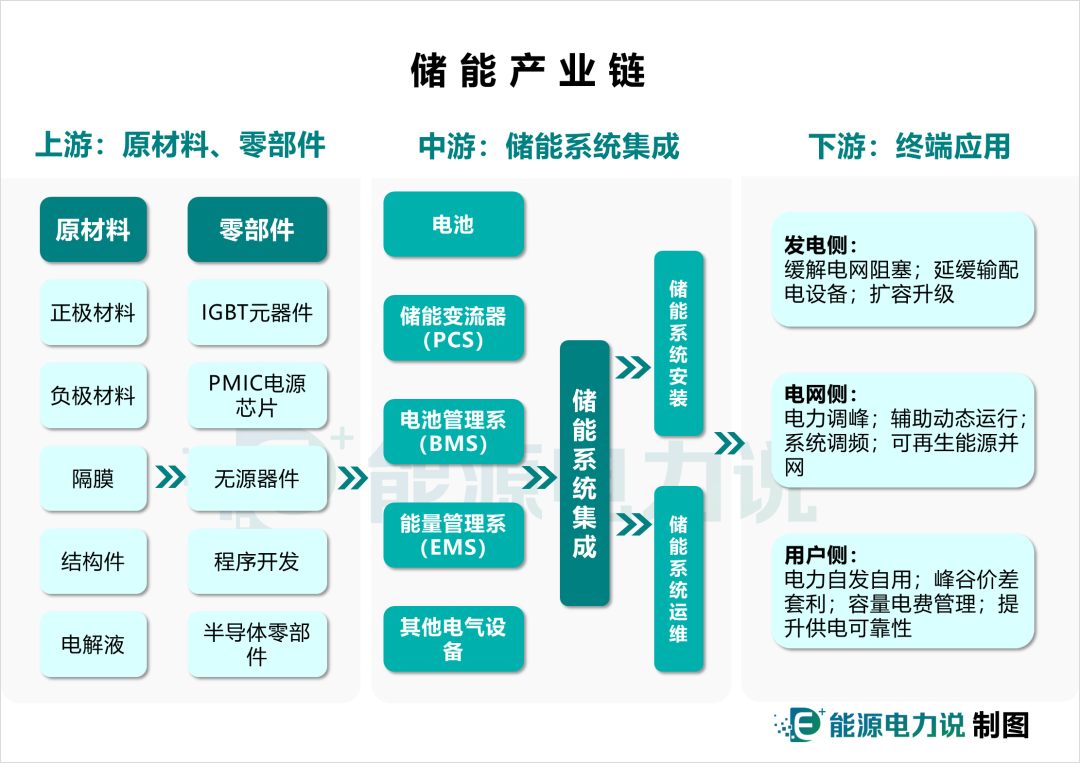 中國(guó)儲(chǔ)能網(wǎng)訊:從電化學(xué)儲(chǔ)能系統(tǒng)產(chǎn)業(yè)鏈來(lái)看,上游是電池原材料、電子元器件供應(yīng)商等;中游是儲(chǔ)能系統(tǒng)集成;下游應(yīng)用端則是風(fēng)光電站、電網(wǎng)系統(tǒng)、戶(hù)用/工商業(yè)、通信運(yùn)營(yíng)商、數(shù)據(jù)中心等終端用戶(hù)。一個(gè)典型的電化學(xué)儲(chǔ)能系統(tǒng)主要由電池、儲(chǔ)能變流器(PCS)、電池管理系統(tǒng)(BMS)、能量管理系統(tǒng)(EMS)四個(gè)核心部分構(gòu)成。