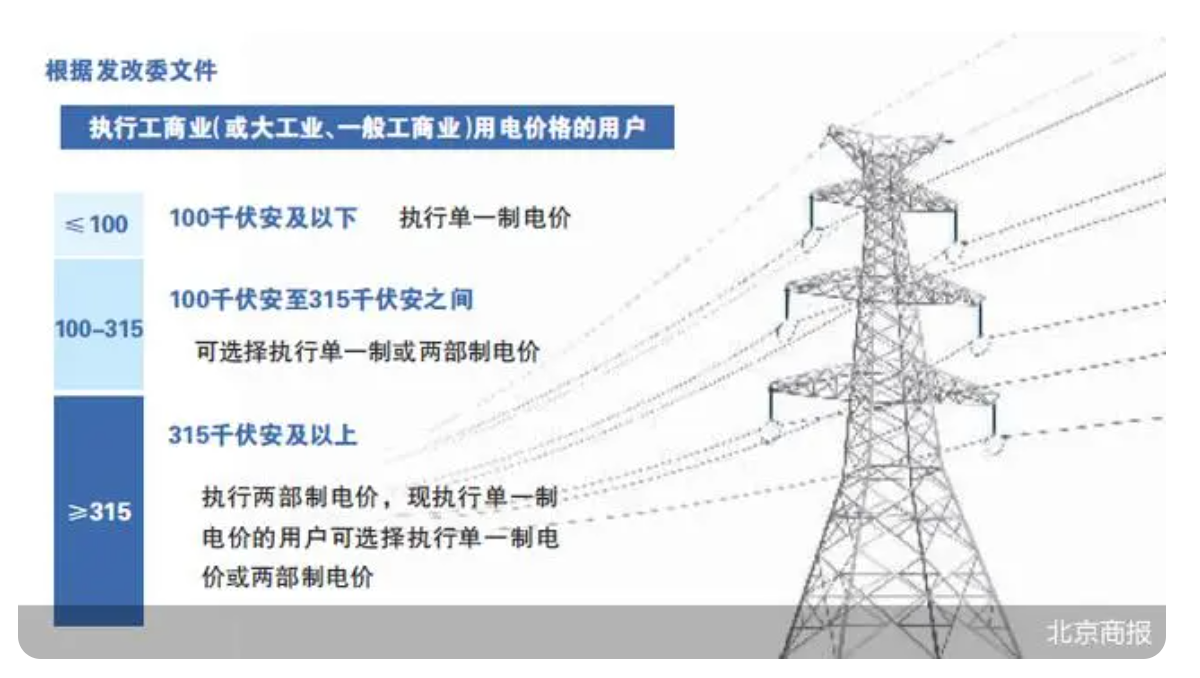 那么,此次調(diào)整中在工商業(yè)方面提及單一制電價和兩部制電價意味著什么?一位電力行業(yè)從業(yè)者向北京商報記者介紹,這實則代表著標準的統(tǒng)一,“以前,兩部制電價主要適用于大工業(yè)用戶;單一制電價適用于除大工業(yè)以外的工商業(yè)用戶。此次調(diào)整則是將大工業(yè)用戶和除大工業(yè)以外的工商業(yè)用戶都統(tǒng)一到了用電容量這一標準之下”。