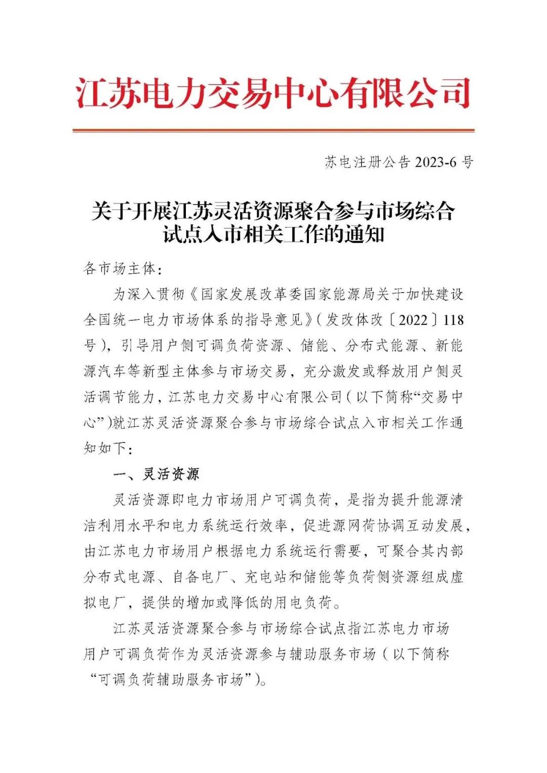 關(guān)于開展江蘇靈活資源聚合參與市場綜合試點(diǎn)入市相關(guān)工作的通知
