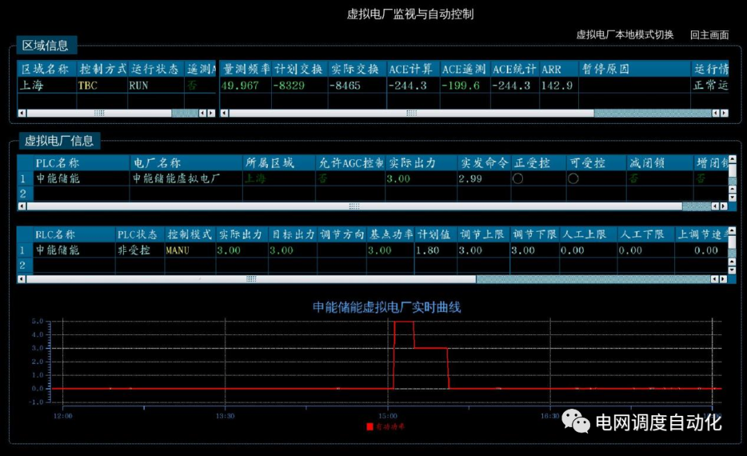 為驗(yàn)證前期虛擬電廠接入成效,借此高溫緊平衡的場景,調(diào)控中心臨時調(diào)用虛擬電廠調(diào)節(jié)資源,開展虛擬電廠參與電網(wǎng)調(diào)頻的實(shí)測驗(yàn)證。15時04分,調(diào)度員投入虛擬電廠控制功能,按照虛擬電廠上傳的調(diào)節(jié)空間手動測試下發(fā)控制指令,通過反饋的信息顯示虛擬電廠即時正確響應(yīng)。其中申能儲能虛擬電廠放電功率最高達(dá)4.95MW,與電網(wǎng)需求一致,助力頻率穩(wěn)定。
