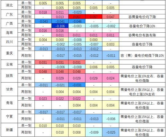 由于新版輸配電價(jià)不再包含上網(wǎng)環(huán)節(jié)線損費(fèi)用和抽水蓄能容量電費(fèi)等影響,要與上一版輸配電價(jià)進(jìn)行對(duì)比,需要將電度輸配電價(jià)、容(需)量電價(jià)、上網(wǎng)環(huán)節(jié)線損費(fèi)用折價(jià)、系統(tǒng)運(yùn)行費(fèi)用折價(jià)作為整體進(jìn)行對(duì)比,在此不妨稱為“綜合輸配成本”。同時(shí)由于上網(wǎng)環(huán)節(jié)線損、系統(tǒng)運(yùn)行費(fèi)用隨每個(gè)月購(gòu)電價(jià)格、容量提供主體運(yùn)行變化等因素而略有變化,嚴(yán)格意義上下表只表明6月份的綜合輸配成本與第二周期輸配電價(jià)的對(duì)比,但對(duì)于新周期輸配電價(jià)的增減情況能提供大概的信息。筆者整理各省6月份綜合輸配成本與上一周期輸配電價(jià)對(duì)比如下表: