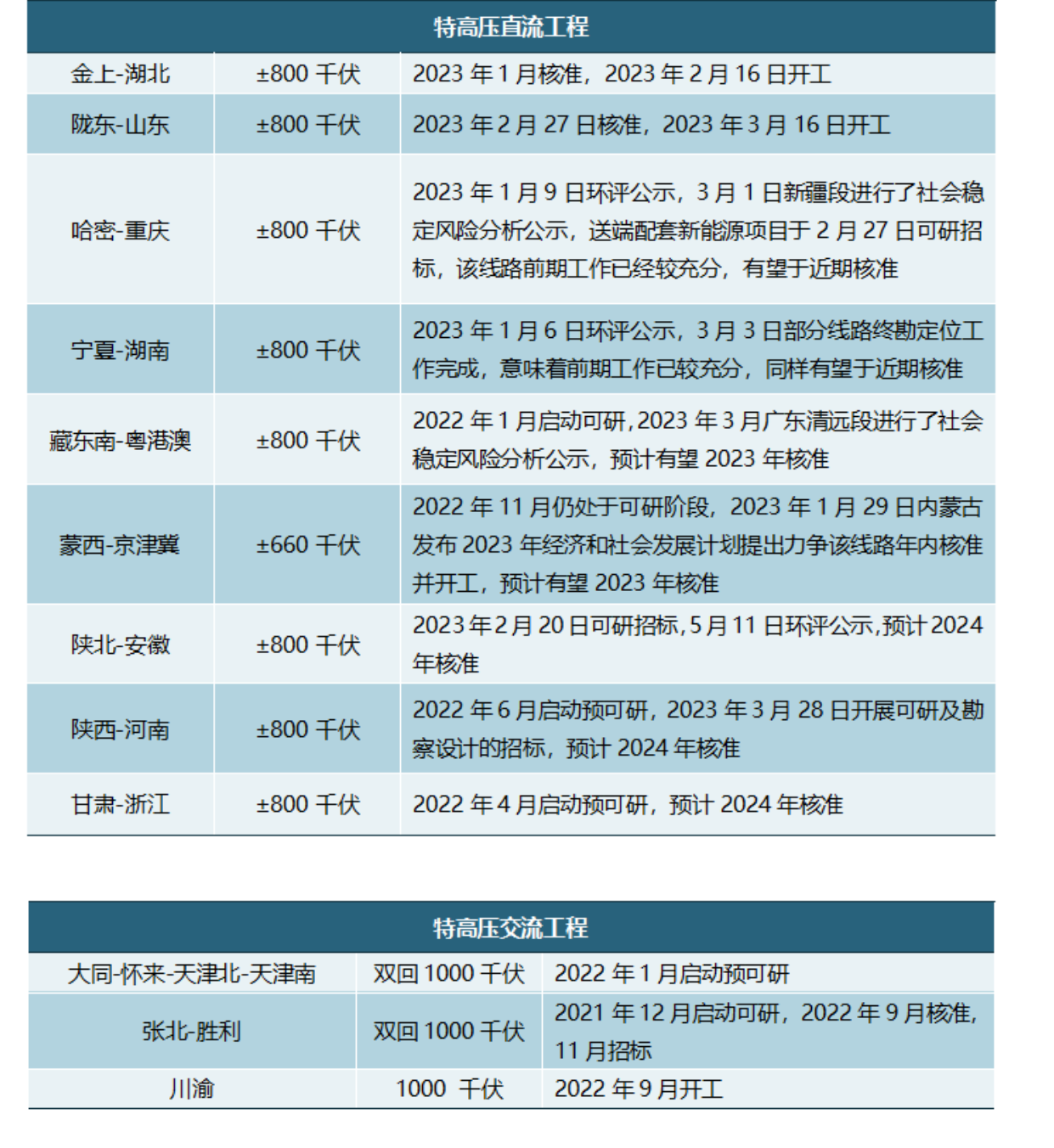 進入2023年,以沙漠、戈壁、荒漠地區(qū)為重點的大型風(fēng)光基地建設(shè)正在提速。隨著大型風(fēng)光基地建設(shè)提速,新能源并網(wǎng)消納以及跨區(qū)域電力輸送問題亟待進一步解決,特高壓有望迎來投資建設(shè)高峰。
