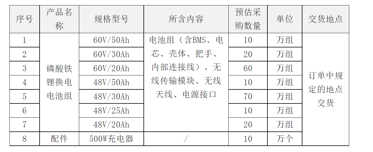 據(jù)此前招標(biāo)公告,本次集中招標(biāo)共2.94GWh磷酸鐵鋰換電電池組,500W充電器10萬個。本項目電池組不含稅報價單價不得高于1.283元/Wh。
