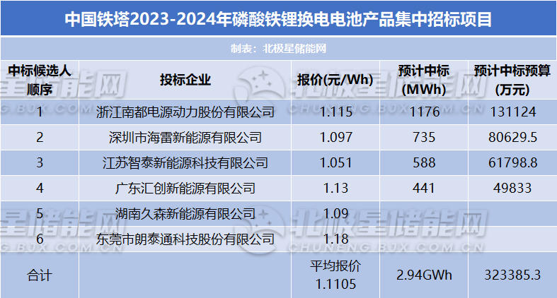本次評選結(jié)果,6家企業(yè)報價單價平均為1.1105元/Wh,前四名中標(biāo)候選人預(yù)計將獲得中標(biāo),預(yù)計總中標(biāo)預(yù)算323,385.3萬元。