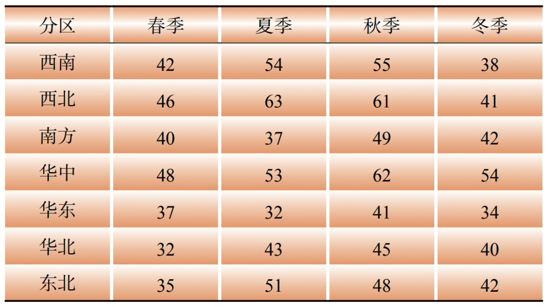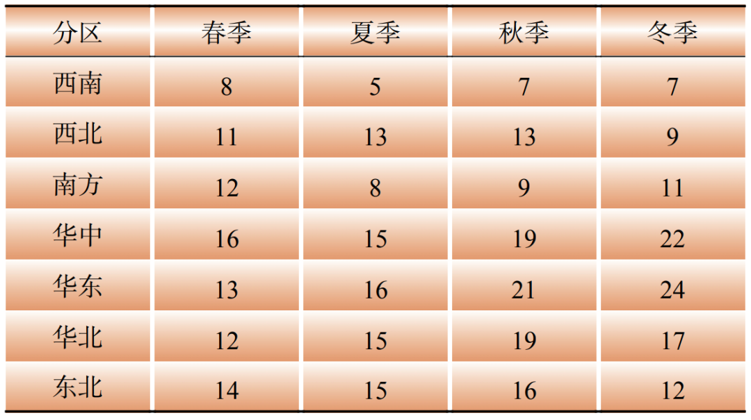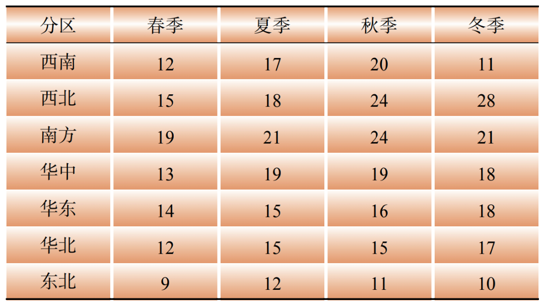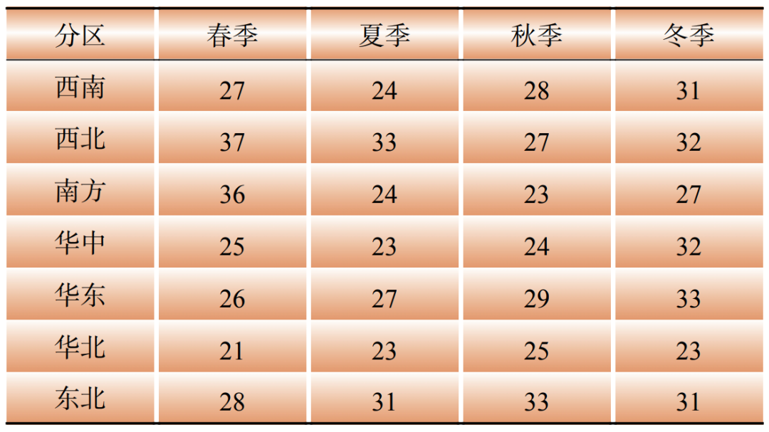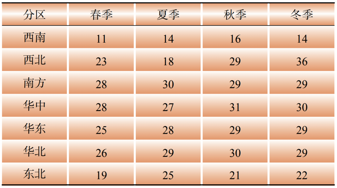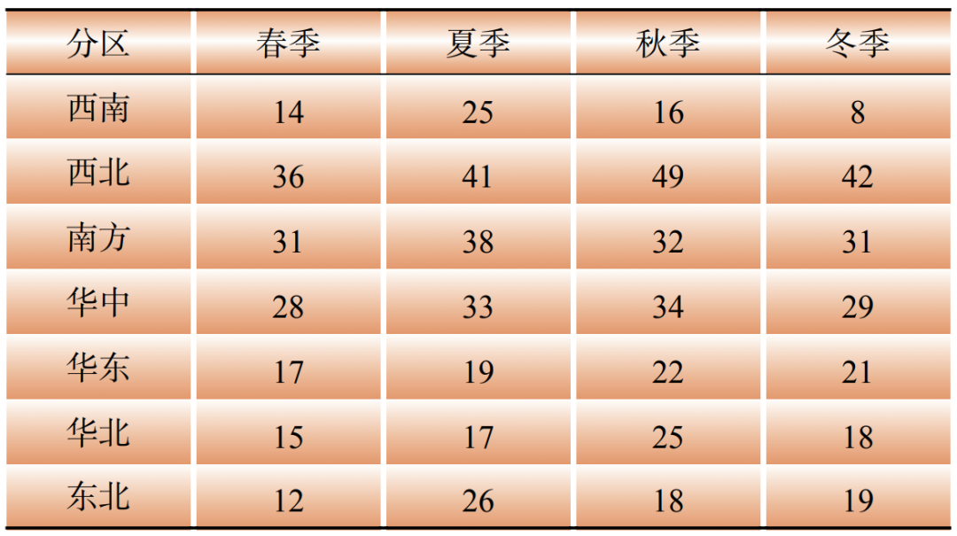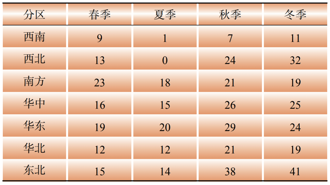 通過剔除夜間的無光時段,中國日間持續(xù)4 h太陽能低出力的分布情況呈現(xiàn)明顯的季節(jié)和地域分布差異。其中,持續(xù)4 h無光的事件在春秋兩季主要分布在長江中游、中下游地區(qū)(西南地區(qū)東部和南方地區(qū)北部)以及吉林、遼寧一帶東北地區(qū)(見表5),平均發(fā)生頻次可達9次和6次。在秋冬交替的時段,這些地區(qū)的無光事件發(fā)生頻次均有所降低。而西北地區(qū)在剔除夜間無光時段影響之后,其在春秋季節(jié)基本沒有持續(xù)4 h無光事件的發(fā)生。持續(xù)4 h微光事件在秋冬兩季發(fā)生頻次較高,其中頻次高發(fā)地區(qū)主要位于西南的重慶、四川東部、山西南部一帶和西北地區(qū)中新疆的西南部地區(qū)(見表6),局部地區(qū)平均發(fā)生頻次可達51次和38次,且在冬季高頻次微光事件發(fā)生的地區(qū)覆蓋范圍更廣。相比之下,春夏兩季全國范圍內(nèi)微光事件發(fā)生頻次較低,平均頻次為16~20。持續(xù)4 h少光事件(見表7)在春、秋、冬季均有較高的發(fā)生頻次。與微光事件的區(qū)別在于,秋冬兩季的高頻次地區(qū)除長江中下游以外,在以黑龍江北部為代表的東北電網(wǎng)也有較高頻次發(fā)生。而在春季,少光事件的高頻次地區(qū)主要出現(xiàn)在以準噶爾盆地和塔里木盆地為代表的西北地區(qū)以及四川、湖南和湖北為代表的中南部地區(qū)。