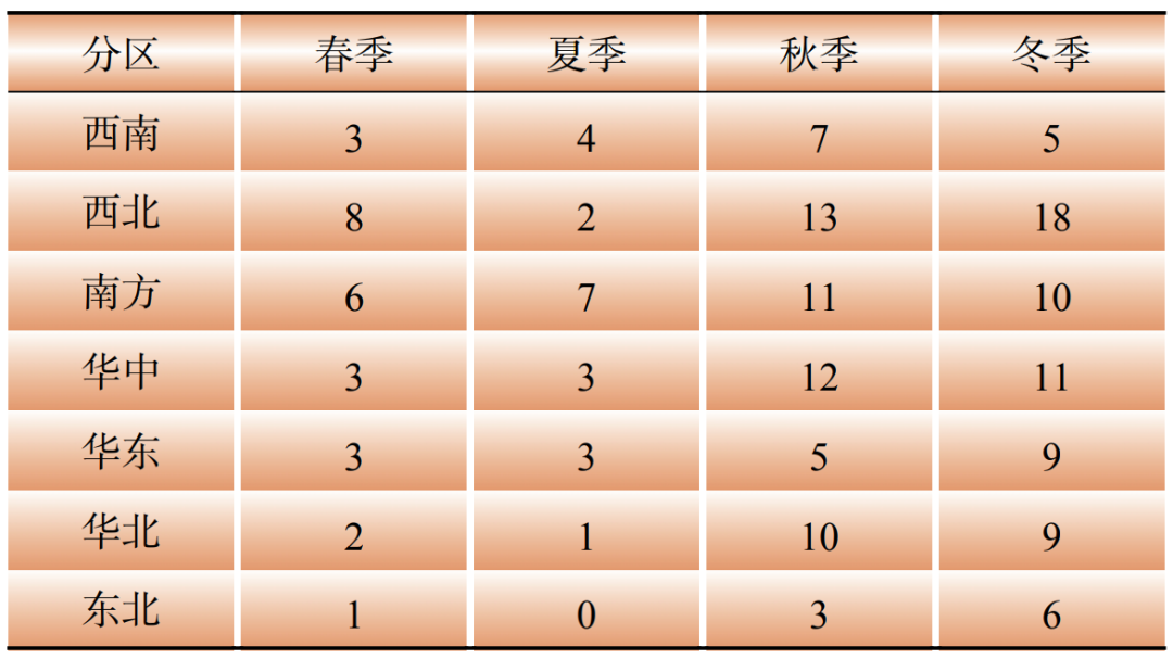 中國高頻次微光和少光事件出現(xiàn)較為集中的時間段為秋冬兩季,在冬季出現(xiàn)時間占比最大,分別達到56%和68%。無光事件因其僅于秋冬季節(jié)在四川東北部地區(qū)出現(xiàn)不超過3次,因此不做詳細分析。持續(xù)18 h微光和少光事件出現(xiàn)次數(shù)較高的區(qū)域主要位于新疆準噶爾盆地一帶、四川盆地和東部沿海地區(qū)(見表3和表4)。其中持續(xù)18 h微光事件在冬季以準噶爾盆地周邊地區(qū)發(fā)生頻次最高,區(qū)域平均頻次達55次以上。而東北黑龍江大興安嶺北部地區(qū)微光事件發(fā)生的頻次同樣較高(52次以上)。整體上,微光和少光事件發(fā)生頻次在冬季呈現(xiàn)“北高南低”的分布特征;而在春季則恰好相反,高頻次地區(qū)集中分布于長江流域以及東南沿海地區(qū)。在秋冬交替時,高頻次、大范圍的微光和少光事件發(fā)生地區(qū)呈現(xiàn)由長江中下游地區(qū)(西南電網(wǎng)東部和南方電網(wǎng)北部)向東南沿海地區(qū)(南方電網(wǎng)東部和華東電網(wǎng)大部)轉(zhuǎn)移的趨勢,東北和西北地區(qū)的發(fā)生頻次也相應(yīng)增加;而少光事件發(fā)生頻次分布也具有相似規(guī)律。在東北黑龍江北部地區(qū)秋冬季節(jié)少光事件發(fā)生頻次較高(63次以上),而位于西南電網(wǎng)的四川盆地一帶在秋季太陽能氣候風(fēng)險事件發(fā)生頻次較多(52次左右),但冬季在該地區(qū)的發(fā)生頻次則明顯下降,可能是因為四川盆地以及長江中游地區(qū)在秋季會出現(xiàn)持續(xù)的陰雨天氣(例如梅雨天氣),而此類天氣在冬季出現(xiàn)的頻率則有所減少。