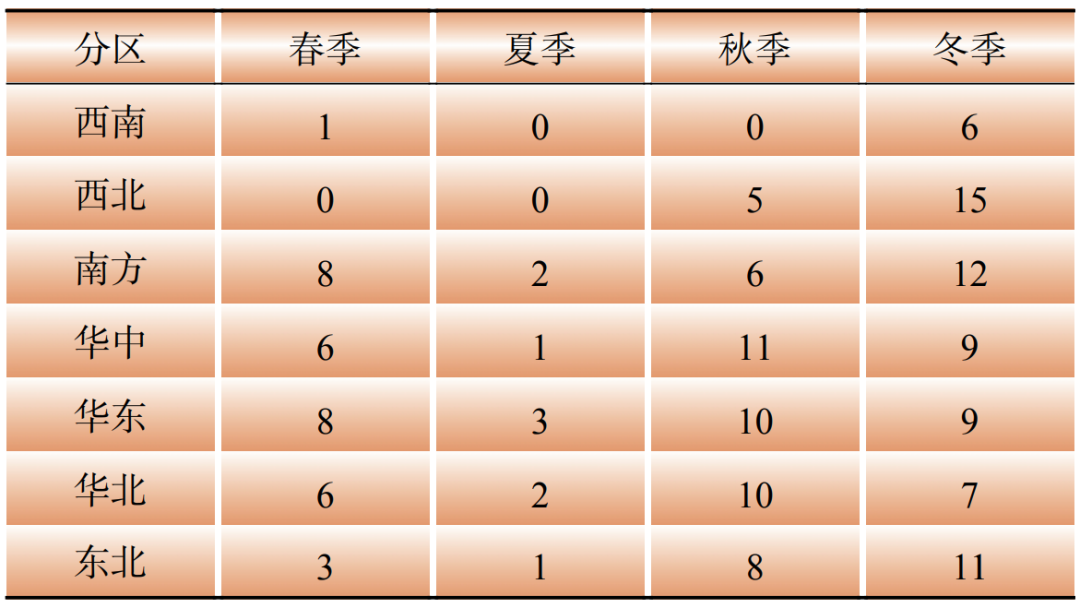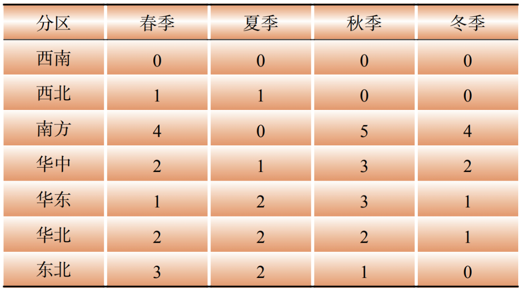 表5 持續(xù)4 h無光事件季頻次(日間)(2007—2014年平均值)