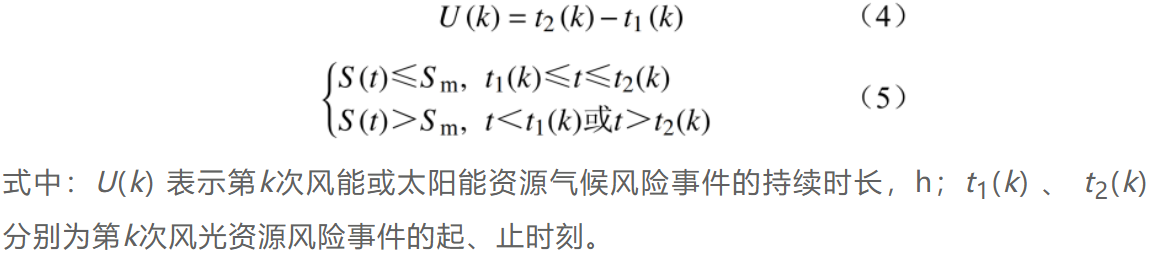 以計算時間段內(nèi)風(fēng)能和太陽能數(shù)據(jù)為輸入,以第一次符合閾值條件的風(fēng)能或太陽能數(shù)據(jù)出現(xiàn)的時間為起始時間,第一次超出閾值條件的風(fēng)能或太陽能數(shù)據(jù)出現(xiàn)的時間為終止時間,計算單次風(fēng)光資源氣候風(fēng)險事件的持續(xù)時間為