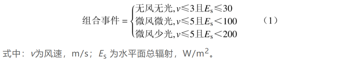 目前中國主流風(fēng)機的切入風(fēng)速一般為3 m/s,根據(jù)單機容量的差異,10%或20%額定功率對應(yīng)的風(fēng)速約為5 m/s[25]。光伏設(shè)施的發(fā)電效率主要有3個階段,在輻射達到30 W/m2時開始具備發(fā)電能力,在100 W/m2時開始對電網(wǎng)進行電能輸出,在200 W/m2時約達到額定功率的20%,因此光資源閾值設(shè)為30、100和200 W/m2[26]。本文根據(jù)風(fēng)電和光伏的出力特性,將v≤3 m/s的事件定義為無風(fēng),v≤5 m/s的事件將被視為微風(fēng);水平面總輻射Es≤30 W/m2的事件定義為無光,Es<100 W/m2的事件定義為微光,Es<200 W/m2的事件定義為少光。風(fēng)光資源組合情景組合事件遵循風(fēng)能和太陽能同時無出力或低出力的原則,設(shè)計為無風(fēng)無光、微風(fēng)微光、微風(fēng)少光3個較為典型的事件,判斷標(biāo)準為