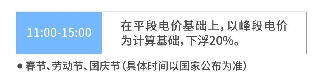 同時,為緩解重大節(jié)日期間電力階段性供大于求的現(xiàn)象,鼓勵和引導有調節(jié)能力的連續(xù)生產工業(yè)電力用戶主動增加用電負荷,提升電力系統(tǒng)整體效能,對315千伏安及以上的工業(yè)用電試行重大節(jié)日深谷電價,在每年春節(jié)、“五一”國際勞動節(jié)、國慶節(jié)期間,11:00-15:00,在平段電價基礎上,以峰段電價為計算基礎,下浮20%。前述三個節(jié)假日具體時間以國家公布為準。