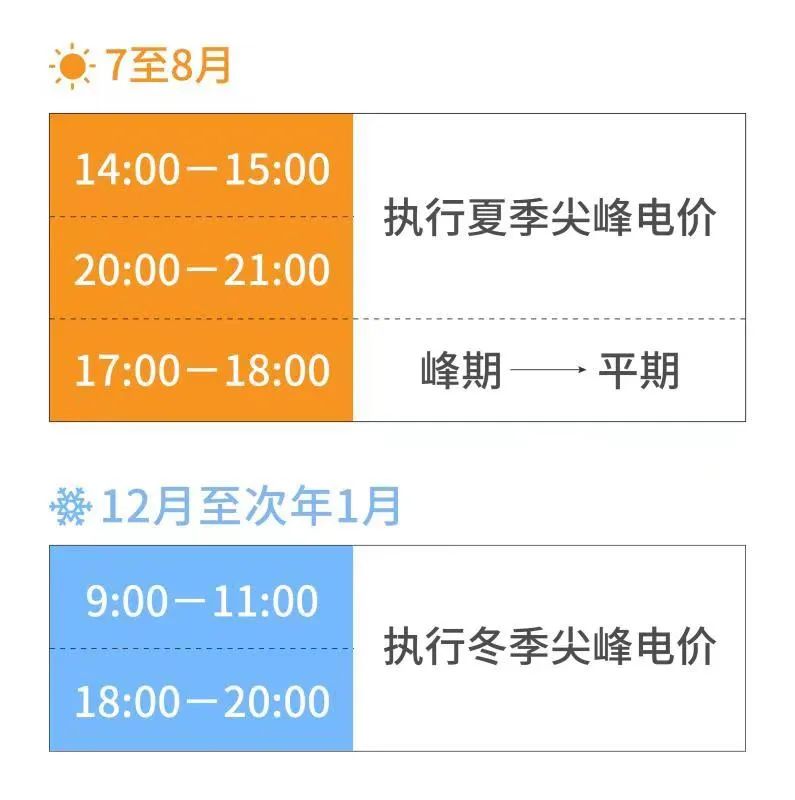 每年7至8月,14:00-15:00和20:00-21:00,執(zhí)行夏季尖峰電價,同時將17:00-18:00從峰期調整為平期;12月至次年1月,9:00-11:00和18:00-20:00,執(zhí)行冬季尖峰電價。夏、冬兩季尖峰電價,統(tǒng)一以峰段電價為基礎,上浮20%。尖峰電價資金統(tǒng)籌用于全省能源電力保供工作。