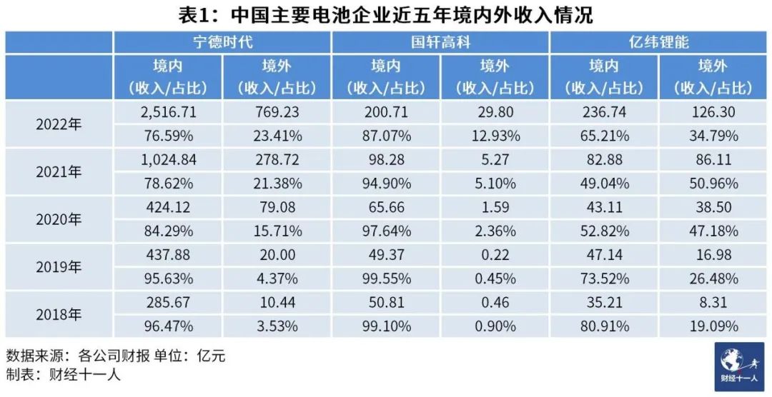 在整個鋰電池出口高速增長的背景下,中國電池企業(yè)的境外收入占比也同步進入快車道。表1中的三家企業(yè)是境內(nèi)外收入構(gòu)成比較典型的三家中國電池企業(yè)。寧德時代是國內(nèi)為主,國外為輔;國軒高科是長期扎根國內(nèi),國際市場剛剛起步;億緯鋰能則是相對偏重境外市場。三家企業(yè)的境外收入都是從2020年開始提速,2021年進入快車道。