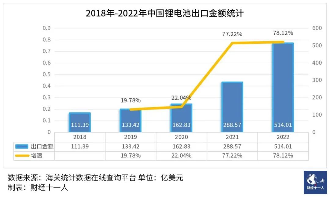 這張圖不論是數(shù)據(jù)還是設(shè)計,都體現(xiàn)出了中國在磷酸鐵鋰電池全產(chǎn)業(yè)鏈當(dāng)中擁有的統(tǒng)治優(yōu)勢。海外研究機構(gòu)和媒體之所以越來越關(guān)注中國電池產(chǎn)業(yè),原因就是中國電池從2021年開始大踏步進入海外市場。2018年,中國鋰電池出口金額首次突破100億美元,2021年突破200億美元,2022年突破500億美元,2023年前四個月,中國鋰電池出口額213.85億美元,從2021年至今,鋰電池出口一直維持70%以上的高增速。