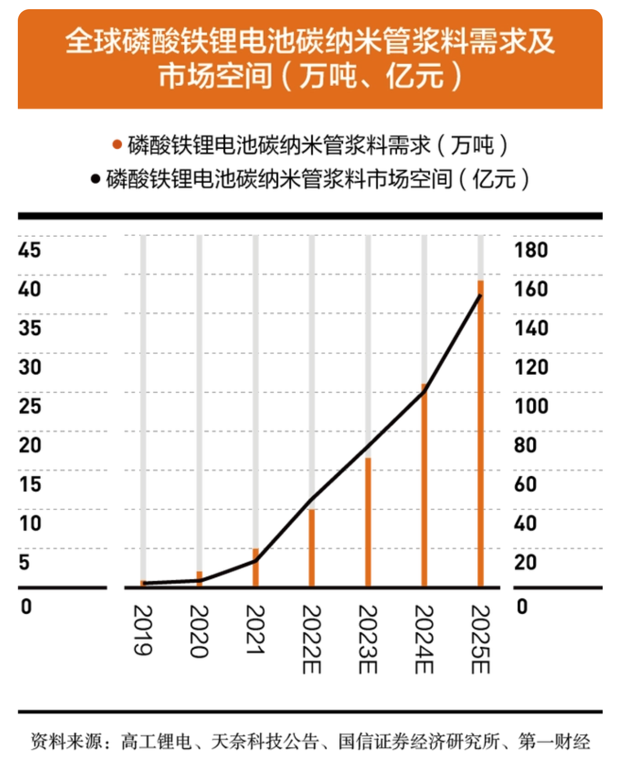 高工鋰電數(shù)據(jù)顯示,2021年全球三元電池碳納米管漿料需求量為3.2萬噸,市場規(guī)模達到13億元,預(yù)計到2025年需求量將達到16.6萬噸,市場規(guī)模達到63億元。