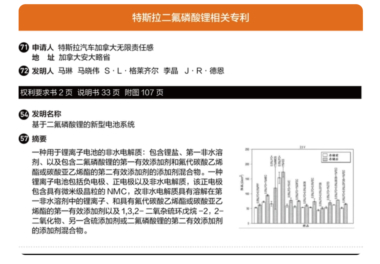 2021年9月,特斯拉申請了“用于儲能設(shè)備的二氟磷酸鹽添加劑化合物及其方法”的專利。特斯拉的目標旨在改變電池單元性能,同時降低其生產(chǎn)成本。
