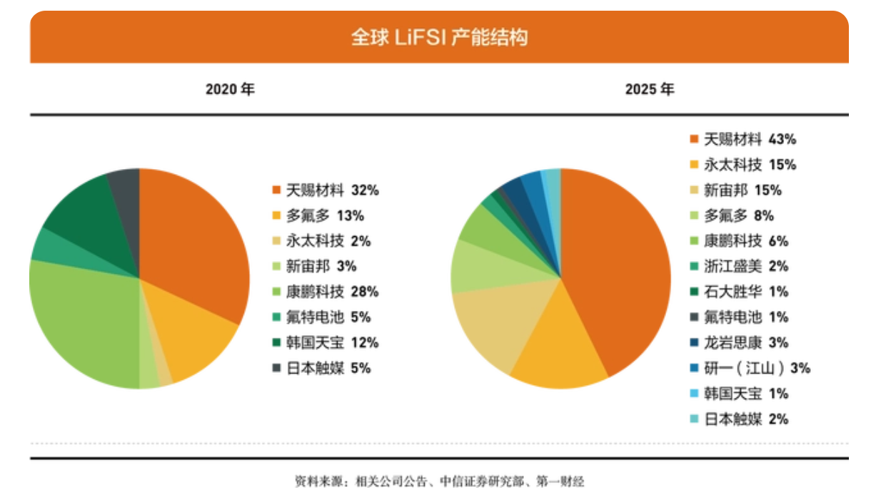 從具體企業(yè)來看,天賜材料(002709.SZ)的LiFSI產(chǎn)能2020年已占全球總產(chǎn)能的32%,2025年預(yù)計可達43%。