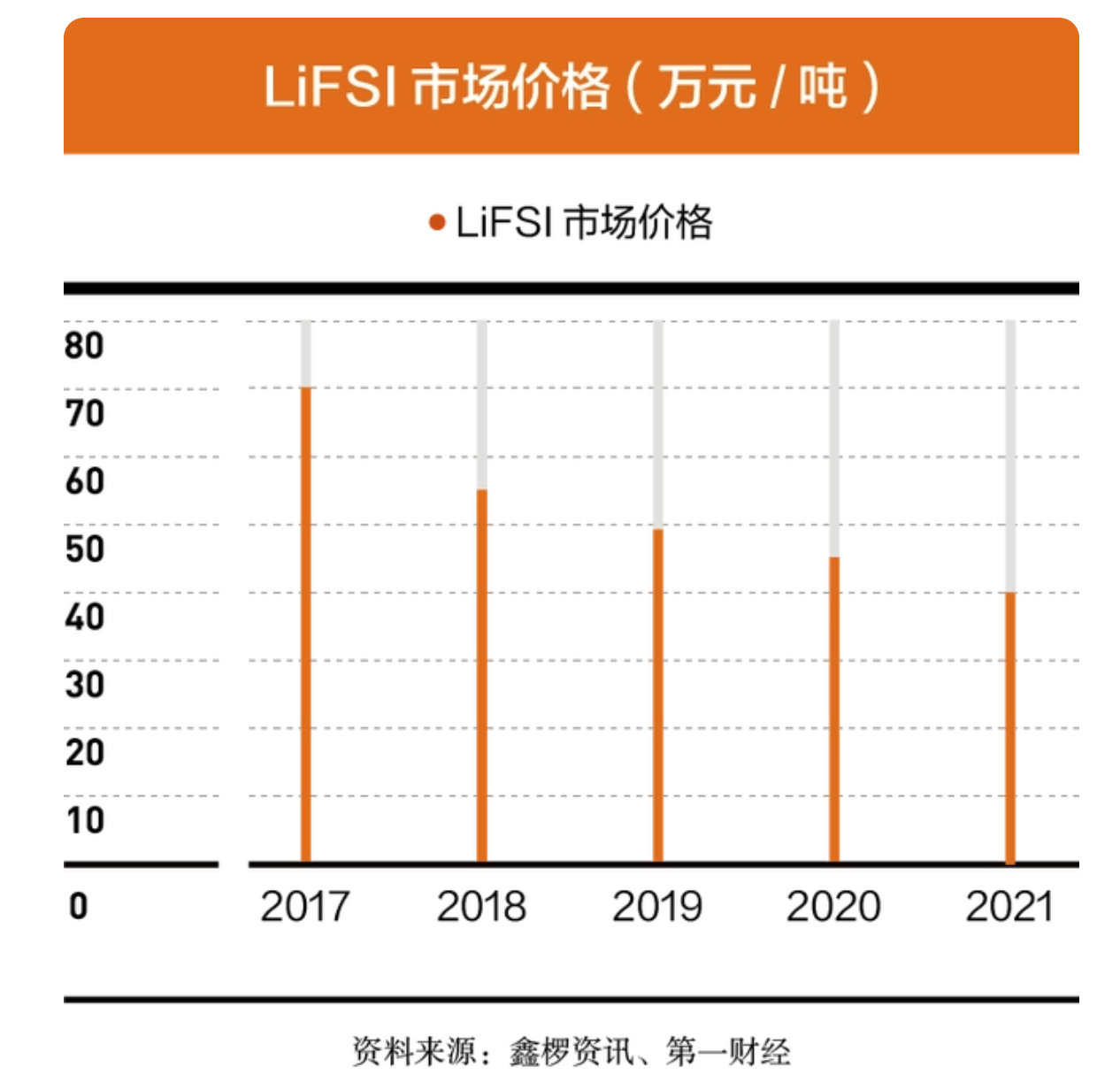 LiFSI的價格也證明了成本確實在逐步優(yōu)化。2017-2021年,LiFSI的單噸價格分別為70萬、55萬、49萬、45萬、40萬元,而六氟磷酸鋰的價格在2021年最高漲至56.5萬元噸,一度超過了LiFSI。