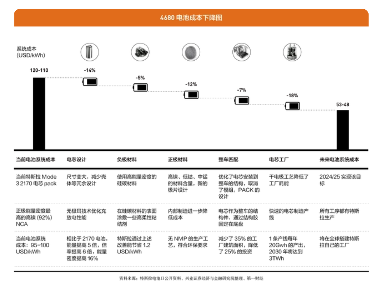 因此,CTC技術(shù)還可進一步降低制造成本。馬斯克曾表示,CTC技術(shù)配合一體化壓鑄技術(shù)使用,可節(jié)省370個零部件、車身減重10%、每千瓦時電池成本下降7%。此外,CTC技術(shù)并非局限于4680大圓柱電芯,2170電芯同樣適用,未來或?qū)⒓嫒萜渌叽珉娦尽?
